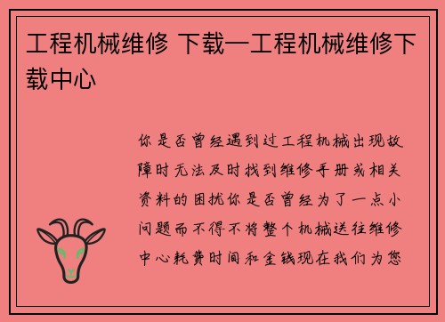 你是否曾经遇到过工程机械出现故障时无法及时找到维修手册或相关资料的困扰?你是否曾经为了一点小问题而不得不将整个机械送往维修中心,耗费时间和金钱?现在,我们为您提供一个解决方案——工程机械维修下载中心,让您的维修之路变得更加简单、高效!